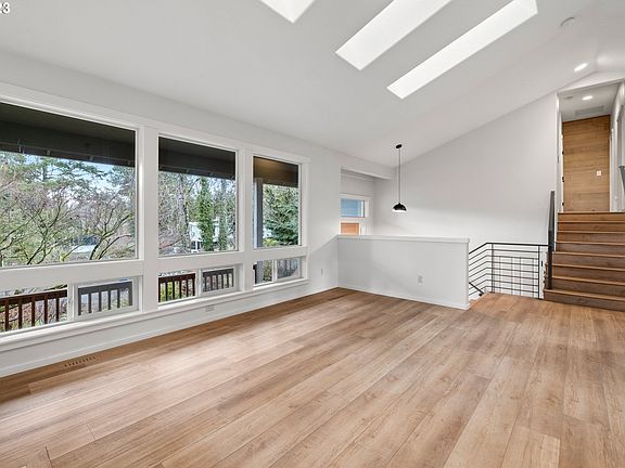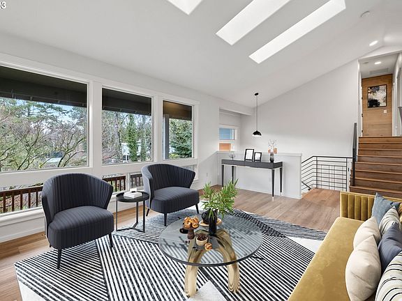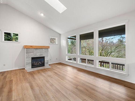 Beautiful Northwest Contemporary, private setting w/open floorplan. Many updates incl. paint, gas fireplace mantle & surround, gorgeous newer luxury vinyl flooring, custom railing, newer siding, paint. New furnace & A/C, Vaulted ceilings, new solar Velux skylights, large windows. Finished Office space in oversized finished garage. Big covered front porch w/privacy. Lots of storage under home. Large Fully fenced yard w/new fencing. Next to Loll Wildwood Natural Area, Near Tryon Creek Park trails [Home Energy Score = 8. HES Report at https://rpt.greenbuildingregistry.com/hes/OR10213239]