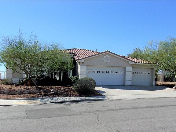 Amazing views of the Colorado River and local mountains. Located in Cottage Hills with semi custom homes, NO HOA. Single story, 2380 sqft., 3 bedrooms, 2,5 baths, den living room and family room. Kitchen with island, breakfast bar, staron countertops, pantry with pull outs and tile flooring. Master bedroom with entry to back covered patio, master bathroom with double sinks, separate shower, and tub, walk in closet. Desert landscaped front and back, with wrought iron fencing in back, 3 car finished garage with storage cabinets and water softner. The 1 car garage has cabinets and ac unit and be used as a work shop.