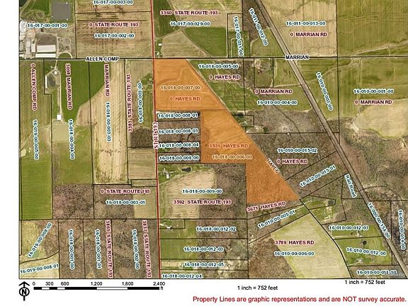 32 acres of tillable land and 28.498 acres wooded. Frontage on 3 roads. 20x40 garage with electricity and gas. Property has septic, well, electric and driveway. Approximate Frontage: ST RT 193=970', Allen Comp Rd=604' and Hayes=3,450. Old unsalvageable mobile home on property, do not enter mobile home.