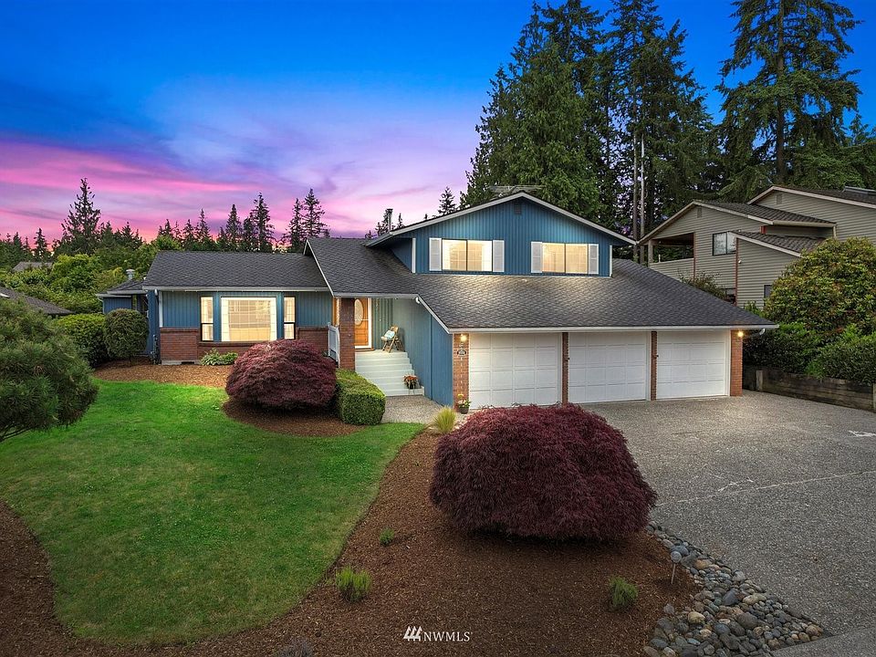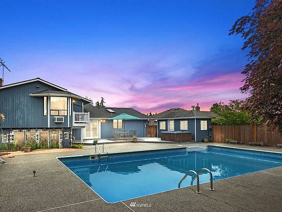NEW PRICE! Quality throughout in this wonderful tri-level home in the Hilton Lake Community. On the main floor, find an open great room living area with gas fireplace, formal dining space and an island kitchen w/ gas range top, granite counters and ss appliances. Beautiful hardwood floors throughout the main floor. French doors open to the private backyard patio with pool and hot tub. The lower level features a large family room with second fireplace and built-ins. Upstairs are 2 large bedrooms plus spacious primary suite overlooking the pool area with a deck that's perfect for relaxing.The home features large laundry room, three car garage, mountain views and much more! Easy access to I-5, Mill Creek, shopping, restaurants and Silver Lake!