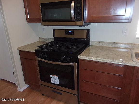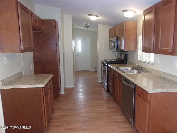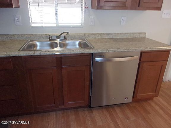 CAMP VERDE A MUST SEE 3 bedroom 2 bath home with covered front deck. Great open floor plan in living room with vaulted ceiling. Dining room has sliding patio doors that open to a relaxing over-sized extended covered porch for your enjoyment. Kitchen has stainless steel appliances, pantry and laundry room. Master bedroom has walk-in closet. Master bathroom features a garden tub and separate shower. Blinds through out the house. Has storage shed on slab and extra slabs for a carport or garage. Low maintenance yard, nice mature trees. Truly move in ready.