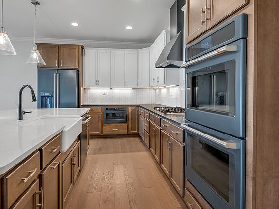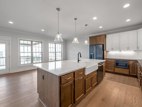 The Wheeler A by Ball Homes, LLC, in The Peninsula! A fabulous 5 bedroom, 4 full bath home on a spacious (unfinished) walk out basement. So many upgrades and lovely finishes in this one! Features include a covered deck near the breakfast area w/'trex' decking, metal ballusters, a family room w/direct vent stone fireplace, first floor guest bedroom w/adjacent full bath, kitchen w/Homecrest (soft close) Kenosha 'Alpine' upper cabinets and 'Karoo' base cabinets, appliances Cafe' matte black w/brushed stainless hardware (dishwasher, double wall oven, microwave, gas cooktop, chimney hood, refrigerator w/hot water dispenser), drop zone at entry from garage, engineered hardwood throughout first floor (carpeted guest bedroom). Staircase w/oak treads leading to a carpeted 2nd floor to a wonderful setting of generous primary suite w/sitting area, primary bath w/freestanding tub, separate tiled shower, large double bowled vanity, tile floors, large primary closet opens to laundry room, hall bath w/ tiled shower, bedroom 3 w/attached bath, 2nd floor loft. Basement w/full rough for future bath. Basement leads out to 14'x11' patio. Rough-in stage. Let us show you finish samples! (179PB)