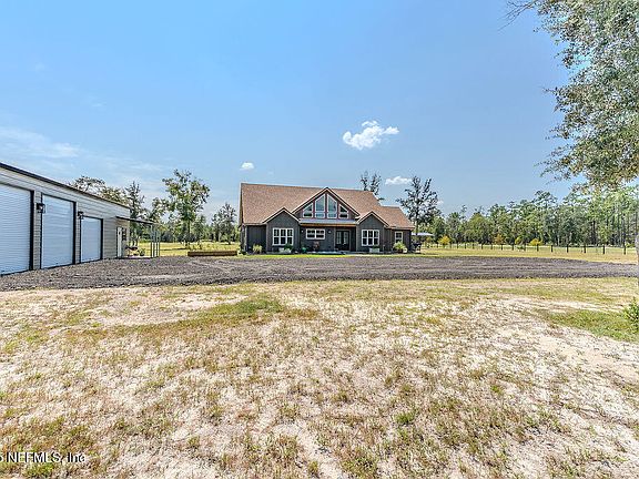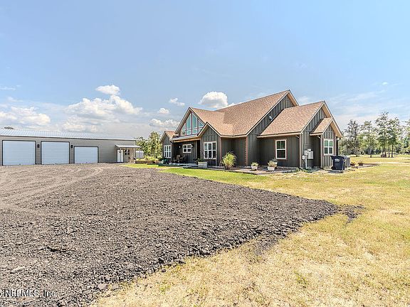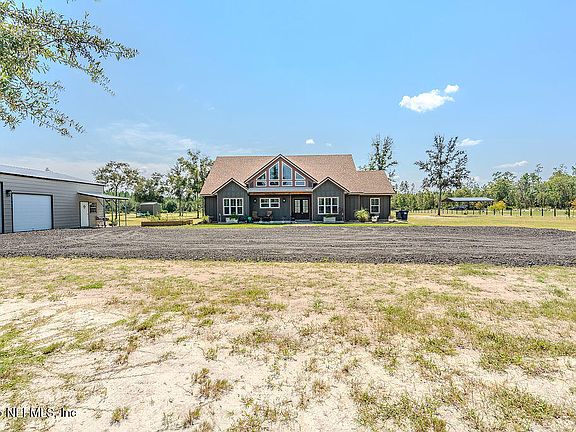 Country charm combines modern comfort with this exquisite custom built home located on 7.49 acres. Main home features 2428 sq ft with 3 bedrooms, 2.5 bathrooms and an office/study. Massive primary suite features sitting room, custom closets, grand en-suite with claw tub, separate custom vanities and custom walk-in shower. Bluetooth is available in bathroom. Open-concept floor plan with 15 ft to 22 ft vaulted ceilings accented with custom cypress beams. Windows at the top are tinted to protect from afternoon sun. Gas fireplace in the family room. No carpet in the home and all LVP or tile floors throughout. Chef's Kitchen features granite countertops, gas stove, wall mount oven and microwave/convection, walk-in pantry and oversized island perfect for entertaining. Plywood in attic area above kitchen for storage. Detached 30x55 building with power and plumbing features two 10x10 bay doors and one 8x10 bay door and a 30x16 (480 sq ft) man-cave or mother-in-law-suite. It contains a bedroom, full bathroom, family room, washer/dryer and refrigerator with 1-ton split unit. There is also a 12x20 shed on the property, chicken coop that houses 16 chickens, raised garden beds and an approximately ¾ acre stocked pond. Dog kennel does not convey. Close proximity to River City Marketplace shops and restaurants with easy access to major highways for commuting to downtown Jacksonville or Amelia Island.