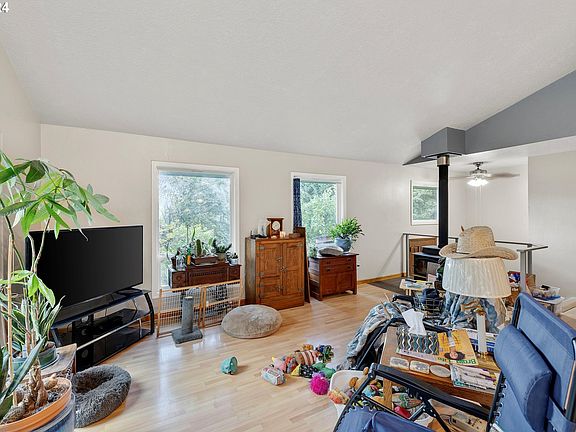 Serene property nestled on 2.5 acres of peaceful, natural beauty in Corbett. Sheltered from the East Wind. This home features a spacious great room with vaulted ceilings, laminate flooring, and abundant natural light from double sliders that lead to an expansive deck. The open-concept kitchen has an island with an eat bar, perfect for casual dining, and comes fully equipped with all appliances included. The large primary bedroom offers its own private retreat, featuring an en-suite bathroom and a slider that opens directly onto the deck. Downstairs, you’ll find a versatile 3rd bedroom or flex room, complete with a pellet stove, a laundry room, and convenient access to the attached garage. Outside, the property offers a slice of paradise with beautiful fruit trees, bamboo, and outbuildings for extra storage or workspace. There’s plenty of room for parking, and the seasonal valley views add a touch of magic to this already idyllic setting.