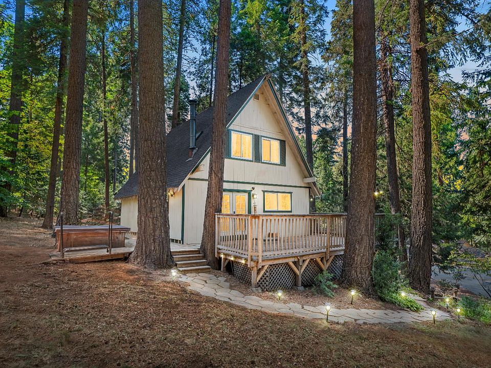 Welcome to your woodland retreat, where the beauty of nature meets the comfort of home. This charming 3-bedroom, 2-bath A-frame cabin exudes rustic mountain character while offering thoughtful modern updates and a fire hydrant on the property. The timeless wood-burning stove and updated central heating and air ensure you stay cozy through every season, while luxury vinyl plank flooring throughout the home adds a warm, modern touch. The spacious kitchen, perfect for cooking hearty meals after a day outdoors, flows seamlessly into the open living area. French doors lead you to the expansive deck, ideal for morning coffee among the pines or evening gatherings under the stars. Two bedrooms and a full bathroom are located downstairs, while the upstairs boasts a generous primary suite and an airy loft, both filled with natural light from large windows and Velux skylights. The updated upstairs bathroom features dark stone tilework, a granite vanity, and a touch-lit mirror that blends rugged charm with refined finishes. As a resident of the Gold Ridge community, you'll enjoy access to a large pool with cabanas, a kids pool, sport courts, picnic areas, a clubhouse, and a gym. At 3533 Golden Ridge Trail, you don't just find a house you discover a lifestyle where every day is a getaway.