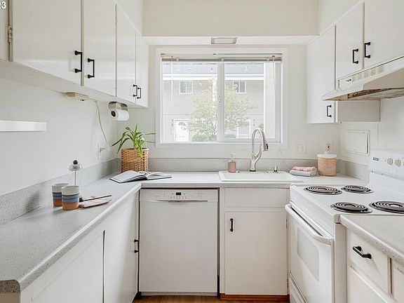 Retro vibes in this 1965 townhouse style condo in the Clinton Kelley complex. Featuring an open floor plan on the main floor, this 2 bedroom 1.5 bathroom is one of the only units with a ducted forced-air heating/cooling system. Spacious rooms and a private fenced back yard big enough for a garden and a pup to run around in. Huge closets offer a ton of storage within the unit. A stacked washer and dryer in the 1/2 bath downstairs is included. Includes 1 dedicated parking spot and a basement storage space. Pet friendly and no rent cap! [Home Energy Score = 5. HES Report at https://rpt.greenbuildingregistry.com/hes/OR10221513]