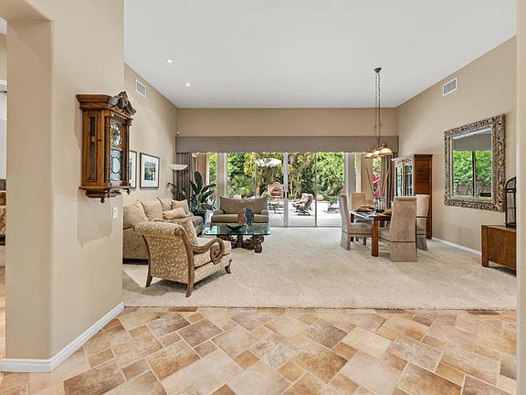 Welcome to Your Dream Home! Discover the highly sought-after Monaco floor plan in this beautifully maintained, turnkey furnished home, ready for you to immediately embrace the quintessential desert lifestyle. The kitchen features granite counters, a large prep island, an abundance of cabinets, a pantry, matching black appliances, travertine flooring, and tasteful decor. The primary suite serves as a personal retreat, complete with a large garden tub, separate shower, a huge closet with built-ins, and private access to the back patio. A second bedroom offers comfort for guests, with a bathroom conveniently located nearby. Two additional bonus spaces provide endless versatility to suit your needs. The lushly landscaped backyard is private and easy to maintain, featuring a tranquil water fountain--perfect for enjoying morning coffee, dining al fresco, or an evening aperitif.