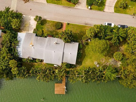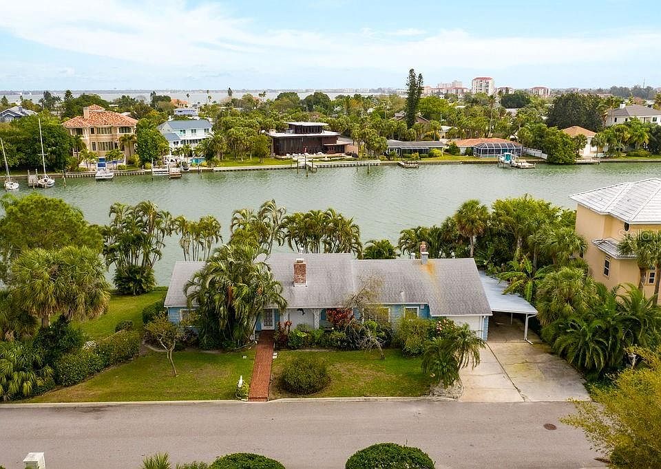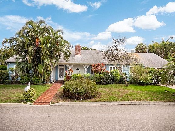 WATERFRONT Florida Charmer! 177 Feet on the water. This is all about land and water. The house is a CLASSIC BELLE VISTA MID CENTURY HOME OVER LOOKING THE SERENE PROTECTED COVE JUST OFF THE INTERCOASTAL WATERWAY. Easy access to the Gulf with no bridge restrictions. The dock is in good shape and a lift can easily be added. This home has 3 bedrooms and 2 baths with a possible 1/2 bath in the garage. There are volume ceilings throughout giving the house an open feeling. This spacious living area has a real wood burning fire place. There is a one car garage and a 2 car carport with plenty of room for a gulf cart. Just off the car port is separate room that can easily be a workshop or art studio. There is also another sperate room located at the end of the garage that is currently being used as storage. The Lanai is the focal point of the house with Dutch doors leading to the over sized screened in lanai. The lanai overlooks the water. The yard is over 1/4 of an acre and is beautifully landscaped creating a very private setting. This property has huge potential. It's located on a quite Cul de sac. Minutes to the beach, shopping and dinning. Super convenient location. There is also a community park just 2 doors up the street