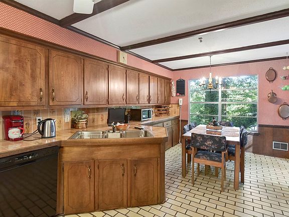 - RoomKitchenFeatures: Ceiling Fan(s), Tile Counters, Eat-in Kitchen, Cabinets-Stained, Floors-Tile, Backsplash-Tiled