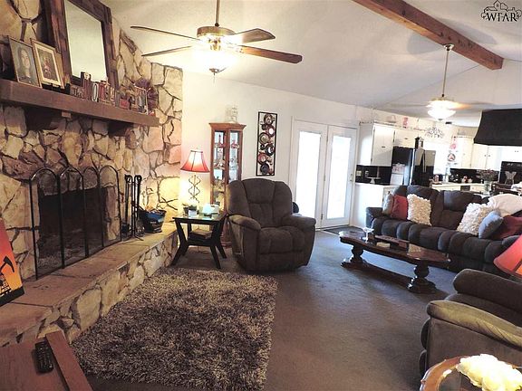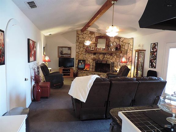 Country living on 5 acres within the City limits. Kitchen features eating area, tile countertops/backsplash, island & built-ins. 2 living areas, formal dining & office area. Huge master suite has plenty of space, double closets and bath w/double sinks, jacuzzi tub & separate shower. Nice size bedrooms & back bedroom could be used as another master as it includes its own bath. Covered patio, wrought iron fence around gunite pool, several outbuildings & neat retreat area at back of land. TO BE SOLD AS IS!