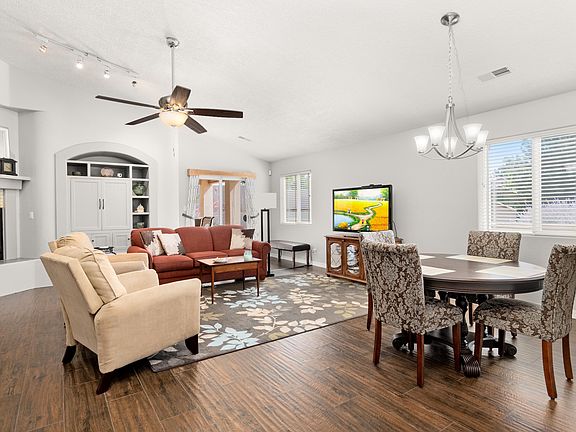 Gorgeous 1story 3BDR/2BA/3CG home in Las Casas de Suenos at High Resort in the heart of Rio Rancho! REFRIG AIR! Beautifully updated flooring; carpet & wood tile flooring! Great room has built-ins, gas fireplace, lots of natural light! Dining rm has mtn views! Kitchen features granite countertops, decorative backsplash, island, walk-in pantry, extra cabinets at bkfst nook!! Updated baths! Primary suite features double doors, dual sink vanity, separate shower, linen closet, large walk-in closet! Incredible outdoor living space with covered and open patios, flagstone, trees, shrubs, rock landscape and walled for privacy. Finished 3CG, utility sink and access to the backyard! Excellent neighborhood with parks, close to Intel, library, aquatic center, schools, dog parks, sports park