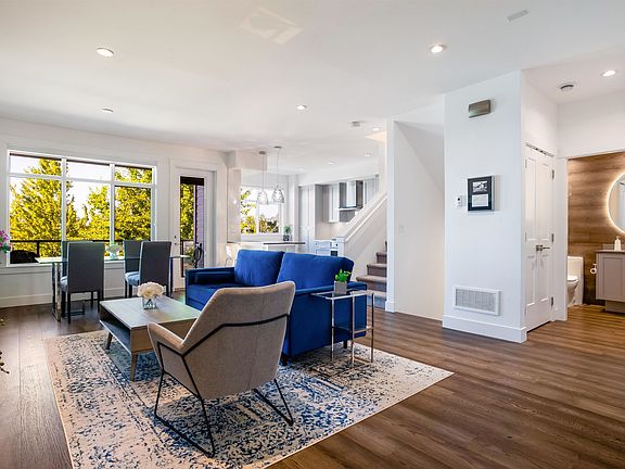 RARE ROOFTOP TOWNHOME WITH STUNNING VIEWS. This 4-bed, 4-bath townhome on Burke Mountain offers 2,621 sq ft of bright, modern living with Fraser River views from two balconies and a massive private rooftop patio. Built in 2020, it features central air, EV charging, engineered hardwood, custom closets, premium appliances, spa-inspired baths, UV roller shades, and a 2-car garage. Perfect for entertaining, with a rooftop ideal for BBQs or morning coffee above the trees. Steps to parks, trails, schools, cafés, and minutes to shops and dining. Strata fees include snow, trash, and grounds for easy, lock-and-leave living.