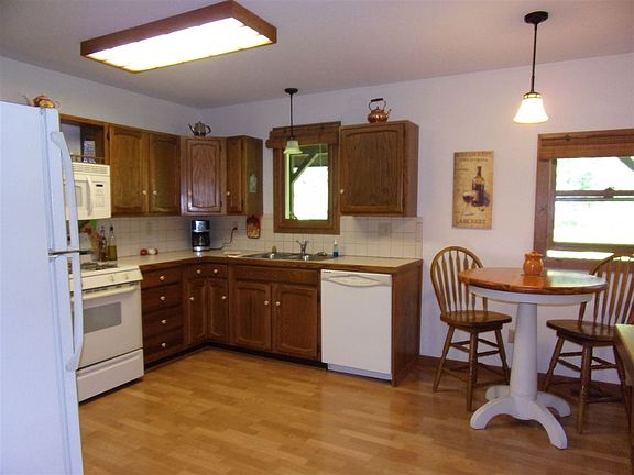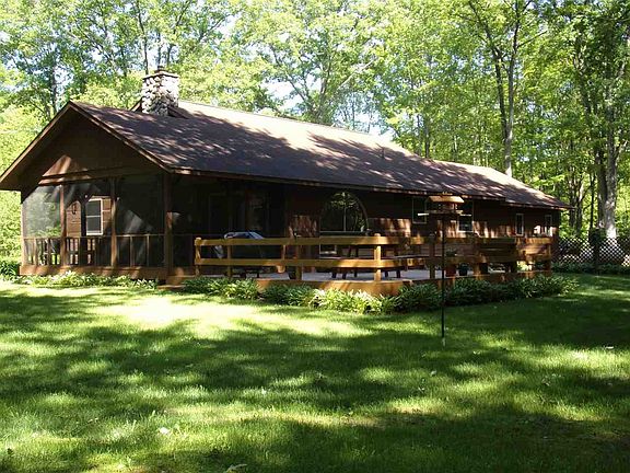 Well maintained home on 9.6 Acres m/l. Set back among the trees, attached 24 x 24 garage plus a 36 x 36 Pole barn with electric to use for horses, workshop or storage. Comes with a coral for livestock. Outdoor spaces allows you to enjoy nature. Large screened porch off the south side for entertaining or open 27 x 20 deck off the eastside of home, take your pick. Inside has a fresh coat of paint, tongue and groove ceilings in the great room with a stone floor to ceiling wood burning fireplace professionally inserted. This room is spacious enough to include the dining area and built-in bar. Many closets for storage plus more storage in the neat, clean painted basement. For the hunter or nature lover in the family this acreage adjoins state land across the entire back of the property.