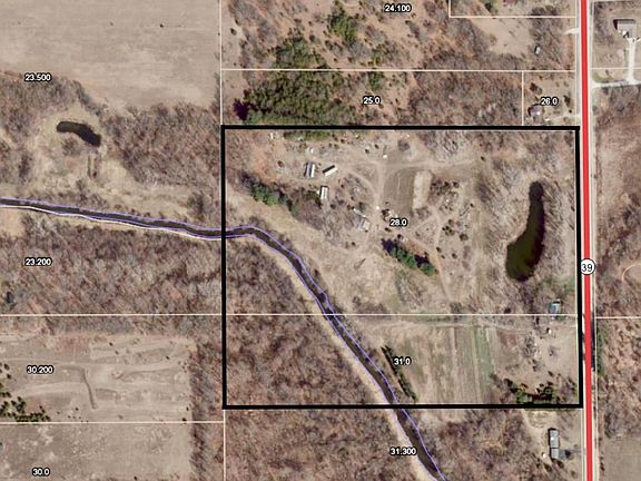 Thirty acres with a small pond, a section of the Bogus Ditch running through, and a fixer upper two bedroom, one bath home with detached garage and outbuildings. Long time homestead ready for a new owner. Nice multi-level block building in back of the home. Easy highway access to local amenities. Property sold as-is.