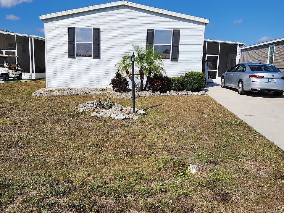 Available Now .This Lovely three bedroom home has updated Kitchen with grey cabinets, nice sized pantry, beautiful warm tone organic granite countertops with tile backsplash. It has a built in microwave oven, glass top self cleaning stove, side by side refrigerator with ice and water on the door, dishwasher. Dinette area has an overhead lighting fixture and window. Behind the louvered doors are the hook ups for your washer and dryer. Lovely Lanai is an all season room with windows and screens and a beautiful tile floor. Master bedroom is King sized with a large closet and its own private master bath with step in shower. Second bedroom has a single sized Murphy bed and Third bedroom has a closet with built in shelving, great for extra storage. Guest bathroom is conveniently located next to both guest rooms and master suite is separated by Living Room. Living Room has lovely wood-look tiled flooring . Central air was replaced in 2021 and has a transferrable warranty. Call today for an appointment!