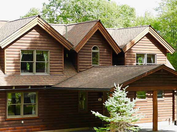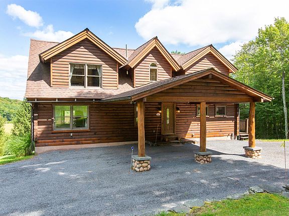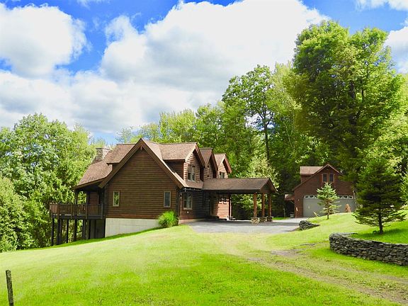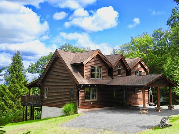 Rarely does a property come along that embodies the spirit and magic of what that Catskills offers - truly A Catskill Mountain Classic. Located in the desirable, highly sought after Canada Hollow Association in Andes, this property offers what the discriminating buyer is looking for - a beautiful custom home, complete privacy, gorgeous mountain views, a spring fed pond and much more. THE HOME - The approach to this custom Alta Log Home is just as beautiful as the stunning location. Driving up a beautiful country road into the understated elegance of the Canada Hollow Association and through a canopy of trees, the house is sited to take in the beautiful mountain views. The porte-cochre provides a welcoming entrance to this 3 bedroom, 4 bath home. The open living plan is ideal for family gatherings, parties and contributes to the relaxed Catskill Mountain lifestyle. The living room features cathedral ceilings, a stone fireplace with large log mantle, wood floors and access to the wrap around deck. The kitchen is designed for those who like to cook offering granite counter tops, a center island, plenty of storage and open beamed ceilings. The main floor en-suite master bedroom has access to the deck and plenty of room for relaxation. At the top of the second floor landing is a writers nook that is also an ideal place to take in the mountain views. Both upstairs bedrooms have open beamed ceilings that give them character and interest and are separated by a full bathroom. In the lowest level there is a large entertainment space with a bar, tin ceilings and a walk out access to the yard. On this level there is also a half bath and a bonus room that adds the the flexibility of the lower level. The wrap around deck adds to the flexibility for enjoyment of the gorgeous natural surroundings. On both sides of the deck is a covered area ideal for dining al fresco or an afternoon card game. The two story detached 2 car garage is perfect for storing all your outdoor toys, those who like to tinker and even has a wood burning stove. The upstairs of the garage is a great place for a studio, a play room, storage or whatever you can imagine. A whimsical garden outbuilding adds to the overall appeal of the property. THE LAND - Simply put - the land is beautiful. A combination of open fields, fern filled forest, large moss covered boulders, the land has dimension and unparalleled beauty. At the base of the property is Weeping Willow Pond - a large spring fed pond with a small dock - a place of peace and serenity. There is a small stream that runs through the property which adds to its list of desirable qualities. Bordered on one side by protected DEP land adds to the lasting value of this property. Ideal SKI HOUSE, COUNTRY HOME and MOUNTAIN RETREAT and about 2.5 hours from NYC the location is both accessible yet private. Don't miss the attached video!