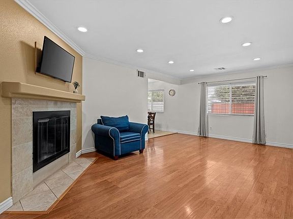 Inside, you're welcomed by a light-filled open layout with beautiful hard-surface flooring, crown molding, recessed lighting, and a cozy tile-accented fireplace—creating a warm and inviting atmosphere from the moment you step in. The spacious living room flows seamlessly into the dining area and into the beautifully updated kitchen—complete with rich wood cabinetry, granite countertops, stainless steel appliances, and abundant storage for everything you need.