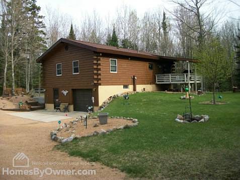 Smoke free open concept half log sided well maintained home in the Northwoods is just 8 miles north of Eagle River Wi. and priced below assessed value. This home is situated on 9.77 acres of wooded land zoned all purpose so animals are OK. Home has 2 bedrooms and 1 bath and there is room in the walk out basement for a third bedroom and is also plumbed for another bathroom also. Home has natural gas forced air heat and AC. There is a one car garage under the home, plus a 24x34 and a 12x24 detached garage. The 24x34 garage has a heated workshop. There is a 14x31 metal RV shelter also. Home has a 3 season porch, gas fireplace, covered deck, 6in drilled well, red grainet driveway and nice landscaped yard. Home includes washer/dryer, range,frig. and microwave. Home is priced at $163,700.00 Any questions please call or email us, Thanks for looking.