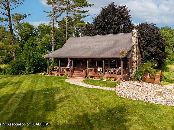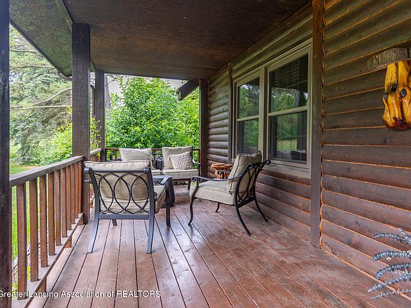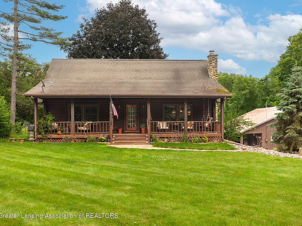 Welcome to 3536 N Royston Rd in Potterville, a truly one of a kind property offering nearly 10 acres of natural beauty, privacy, and versatility. This stunning log-sided home sits on 9.98 acres, over half of which is wooded and includes a scenic pond, perfect for nature lovers, hunters, or those seeking a peaceful retreat. The home blends rustic charm with modern updates, featuring 3 bedrooms and 2 full bathrooms. The main floor offers a spacious primary bedroom, a second bedroom, and a beautifully updated full bath. The kitchen is well-appointed with Corian countertops, a new microwave, GE double oven, Bosch dishwasher, and ÂA¾-inch oak hardwood floors that continue into the dining area and living room. A sliding door from the dining area opens to a large back deck overlooking the wooded backyard. The living room features wood floors, a vaulted ceiling, and a striking LOPI wood stove with a stone backdrop extending to the second floor. Upstairs, you'll find a third bedroom, another updated full bathroom, and a family room/den that overlooks the main living space. The walkout basement includes a cozy family room with vinyl plank flooring, an office area, washer and dryer, Kinetico water softener, and a sump pump.