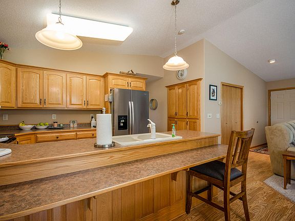 This wonderful Well-Maintained townhouse located on a quiet street creates easy carefree living. Wide open sunny floor plan offers vaulted ceilings, and an abundant of natural lighting. Kitchen displays Oak cabinets w/ newer upgraded appliances in 2019, large sit up breakfast bar and newer light fixtures. The dining room offers patio doors that lead to a maintenance free deck overlooking the well -groomed landscaped yard w/ mature trees. You'll appreciate the MAIN FLOOR laundry adjacent to the double attached garage w/ floor drain. All bedrooms are generously sized and the master bedroom will accommodate a king size bed , has large walk in closet and 3/4 bathroom. The finished Lower level has a walk out patio door, non -conforming guest room, spacious family room w/ daylight windows, 3/4 bathroom, storage and utility room. Monthly fee is $125 and covers lawn and snow care. New Shingles, gutters and downspouts 2017. Must meet 55 yr and older requirement. See this one today!