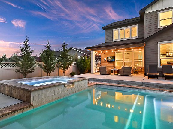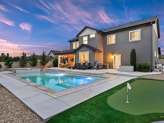Spectacular Biltmore home w/ a private backyard POOL located in the desirable Bridgetower West community! This property is an entertainer's dream with a modern great room design that overlooks the pool/spa & East facing backyard. The heated salt water pool includes raised jetted spa w/ spillway waterfall, 1st step is lg top shelf for lounging, app controlled, & automatic safety cover! The low maintenance backyard also includes a covered patio, in-ground trampoline, & a 3 hole turf putting green! Additionally, the home offers a 4 car garage w/epoxy floors & storage room, 4 bedrooms/2.5 baths, office, bonus/media room w/projector & screen. The kitchen features a lg. pantry & island, SS appliances, quartz countertops, custom cabinetry, & new LVP . Primary bedroom has an ensuite bathroom with dual vanities, tiled shower & spacious walk-in closet. Exterior trim lights installed in front. Subdivision offers parks/playgrounds, clubhouse, community pool, pond & basketball courts. Conveniently located in NW Meridian!