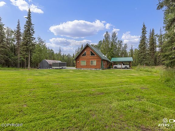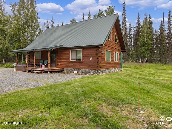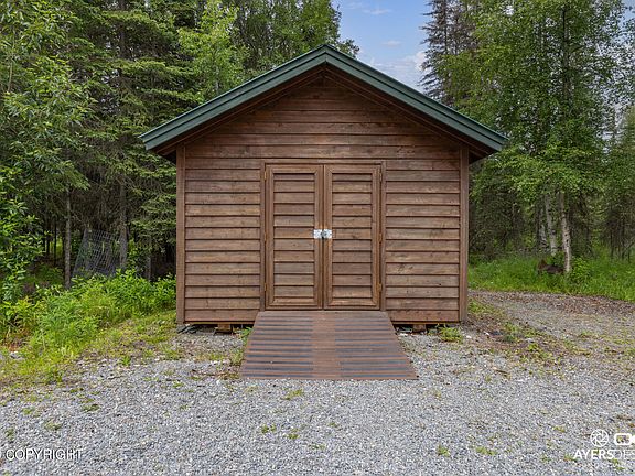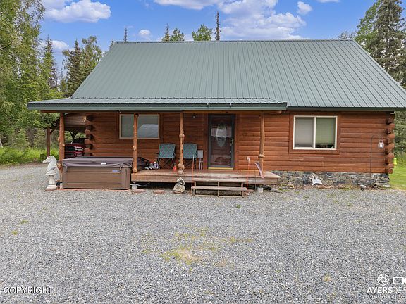 Absolutely perfect Alaskan home or vacation rental! This beautiful log home has tongue and groove vaulted ceilings, a stone fireplace and a charming kitchen! The loft has space for multiple beds, there is a covered Bbq area and parking. Outside is a beautifully maintained yard with an insulated shed that could sleep guests or a perfect area for storage. This is a must see!