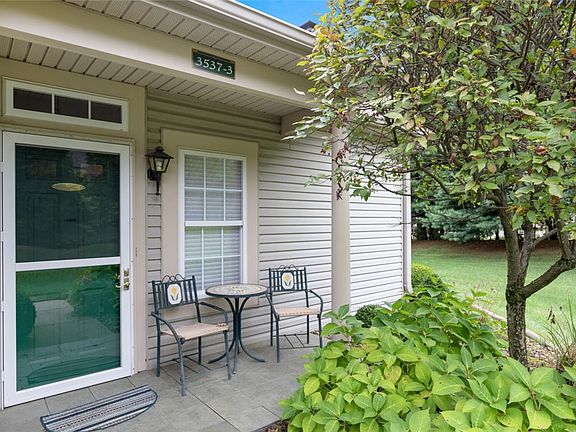 Ease into maintenance-free living without sacrificing privacy in this tree bordered end unit in Hunters Woods. Newer landscaping graces the perimeter of this lovingly kept 3 BR 3 BA condo. Interior space flows openly and presents over 1600 square feet. There is no worry of a shortage of storage as a hall of closets connects this single level to the attached garage, with more room to tuck things away in the attic space residing above the garage. A corner cited sink connects this kitchen’s oak cabinetry to the peninsular seating and serving area and invites open conversation in the great room concept living space. A cozy gas fireplace warms the space residing under a soaring vaulted ceiling and a sliding glass door welcomes you to gather on an intimate patio. East facing windows allow cheerful sunlight to permeate the great room and each of the three bedrooms. Privacy isn’t just for the owner suite as each bedroom connects to a full bath. Community clubhouse with fitness room.