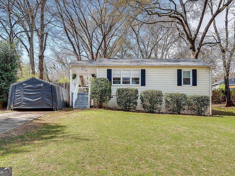 Welcome to this charming friendly neighborhood not far from Belvedere Park, Downtown Decatur, Agnes Scott College, East Lake Golf Club, Dekalb Farmers Market and major highways. This is the perfect starter home for those who are tired of renting or even the investors to add to their portfolio. Inside has been freshly painted with a neutral color that creates an inviting atmosphere throughout the home. The front porch with his white pickets has been freshly painted, and is a great place to enjoy your morning coffee. There is a separate living room with hardwood floors and great natural light that flows through the front windows. This has great closet space for a home from Mid Century, coat closet in hall along with large linen closet. Front bedroom would make great home office/kids room/exercise room with two windows for good light. The middle bedroom has hardwood floors, windows and new light fixture/fan and is across the hall from the other full bathroom. The owners suite with its new neutral carpet has remote ceiling fan/light, private bathroom with pedestal sink, new faucet and fixtures and tub/shower combo. The hall bath has updated new light fixtures, mirror, tub/shower combo, new shower fixtures and black and white vinyl flooring. There is a sep laundry room off the hall, with w/d hook ups, shelf above for storage. Cute kitchen with black appliances, ( all electric no gas), stove and vent hood, side by side refrigerator, dishwasher, plenty of cherry cabinets,2 new windows and good natural light. You have access from the kitchen to the fenced in backyard, newer deck and plenty of space for the grill and to dine Al Fresco most of the year. There is plenty of space for your home garden and to grow your veggies, outdoor entertaining and the pooches!! The house was recently pressure washed and has siding that is very low maintenance. There is a covered Canopy for one vehicle to park under in the driveway. You are in the first tier for The Museum School, (charter school in Dekalb County) and easy access to local amenities, parks and a dog friendly neighborhood. The taxes are not homesteaded as it has been an investment, being sold as-is but upgrades/repairs have been made recently and over time. New roof in 2022, HVAC 13 years old. The key to the crawl space is in kitchen drawer. All staging will be removed (including handing plants) prior to closing.