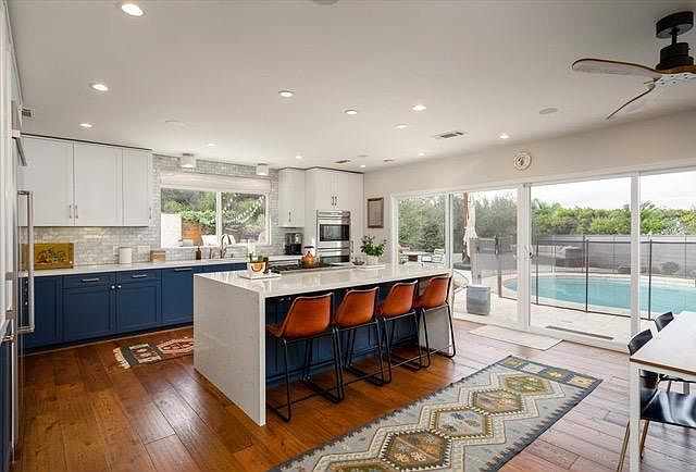 Tucked up on the hill South of Ventura Blvd, in friendly Sherman Oaks this private property sits on a quiet serene culdesac with views of the snowcapped San Gabriels and glittering valley below. Turn the other direction and your views into the canyon are lush and green with epic sunsets. Located just up the hill from top rated Dixie Canyon as well as all the best restaurants of Sherman Oaks. (Petit Trois, The Joint, Coffee Roasters and more.) Inside the home you feel like you're nowhere near the hustle & bustle below. With a spacious open floor plan, abundant in natural light, beautiful craftsmanship and attention to details. Dine indoors in a kitchen with more storage than you can use. Complete with stunning countertops, Wolf & Kitchenaid appliances and a fridge so big it will sustain you for months. Don't miss the built in wine fridge! Afterwards snuggle up next to the gas and wood burning fireplace. Or dine al fresco as you watch the sunset over the canyon and city below. Pick a door from any room and access the pool the courtyard, the outdoor dining area and BBQ, or the grassy yard. This classic 'U' shaped mid century modern is a perfectly laid out home. One wing for bedrooms/office and the other wing for dining, lounging and entertaining. The primary bedroom and bathroom are both large with big windows and tons of natural light- yet all the privacy you want. Huge walk in closet to top it off. All situated at the end of the bedroom wing for that get-a-away feeling. The three other spacious bedrooms have big windows, and sizable closets outfitted with built in shelves and drawers. One bedroom has an exterior entrance and en suite full bathroom. Size-able two car garage wired for electric vehicle charging with built in shelving and cabinets. House comes with gardeners, pool person, and Vivint security system. Smart home with two HVAC systems and Nest thermostats. Will be rented UNFURNISHED & available for longterm rental. Owner pays for pool and Gardner.