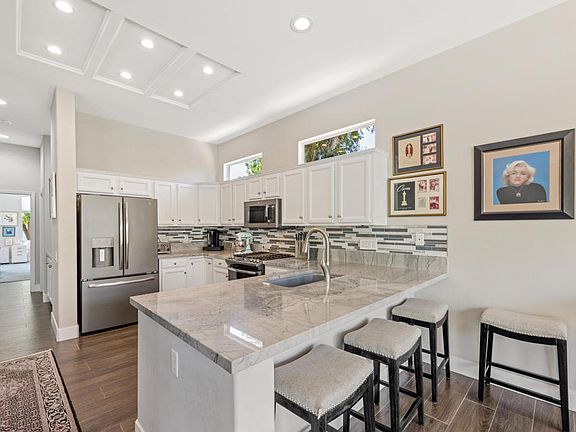 Sun City Palm Desert. Remodeled Tanjier (3 bedroom 2 bath home, approximately 1900 square feet. WELCOME TO A BRAND NEW HOME in a quiet location of Sun City! Everything has been done to make this home PERFECT! You will not have to do a thing to it! Enter with a wall of glass viewing a beautifully landscaped back patio with a waterfall, trees, flowers, extended custom overlay decking....so very private and peaceful to look at! GREAT ROOM floor plan with beautiful gray tile throughout (except bedrooms). Kitchen has beautiful quartz counters, lovely cabinets with stainless appliances. Beautiful eating area overlooking the lovely back patio . Master bedroom has huge windows (bringing in the view of the flower filled back patio), a new beveled bathroom mirror, custom closet with mirrored sliding doors, and totally redone huge shower with a 1/2' glass shower enclosure! The secondary bath has a new sliding glass doors in the tub/shower combo. Closets by Design customized all three bedroom closets and the work bench in the garage. All window treatments are quality Levolor Shades. And speaking of the garage, it is air conditioned, with lots of storage and an epoxy coated floor. This home has EVERYTHING on your list....so call today. All in the wonderful community of Sun City Palm Desert, with golf courses, tennis, pickel ball, bocce courts, gyms, pools and 70+ clubs to meet people! Life is a dream here!