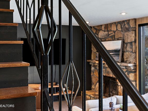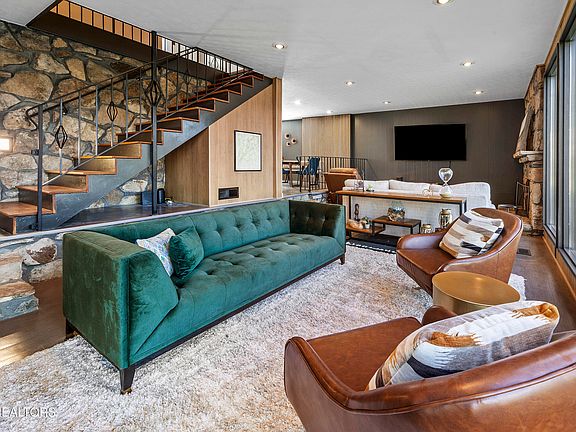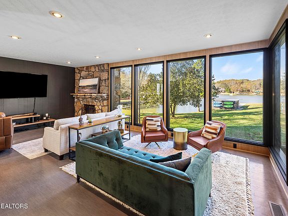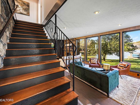 Mid Century Modern Home on the Water! Boasting Walls of Floor to Ceiling Windows (New Low E Insulated Glass) in the Livingroom and Main Bedroom facing the water. This property is situated directly on the shores of a small quiet cove just off the Tennessee River, Providing stunning waterfront views. Standout features include 200 feet of waterfront with a boat house and large covered area on the water, great for entertaining, offering a convenient and secure spot for boats, jet skis, or other watercraft. It may also serve as a relaxation area, perfect for lounging, fishing & swimming. This home offers almost 1800 sqft of main level living with plenty of space to play. Overall, a 3-bedroom, 2.5-bathroom lakefront property with a large boat dock offers a perfect blend of comfort, luxury, and outdoor adventure, making it an appealing choice for those seeking a waterfront lifestyle, while enjoying sunsets from the rooftop deck of a well-built Mid Century Modern home.