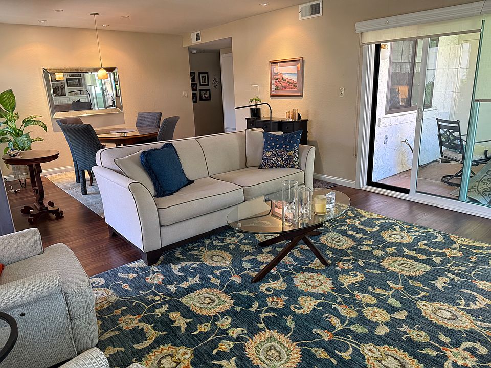 Freshly painted unfurnished condo with 2 master bedrooms/2 baths on GROUND FLOOR in established neighborhood with lots of trees and grass.. Large 2 car garage, double pane windows, garden area, upgraded kitchen and bath and fireplace, built in bookcase with light next to gas fireplace, laminate flooring/carpet in bedrooms, ring doorbell. All lights on dimmers for ambiance. Easy access to Highwat 5. Quiet spacious patio. Good neighbors and lots of parking. 10 minute walk to One Paseo and the Del Mar Highlands Plaza. One block from Solana Highlands Elementary School. 10 minute drive to the Del Mar beach! Owner pays for water/garbage pickup/homeowner fees. Tenant pays for utilities and cable/internet.
