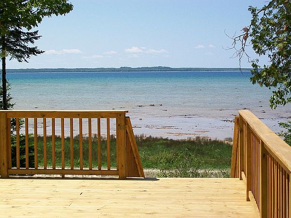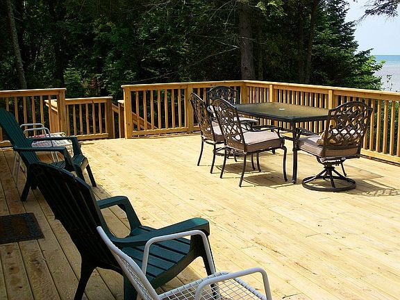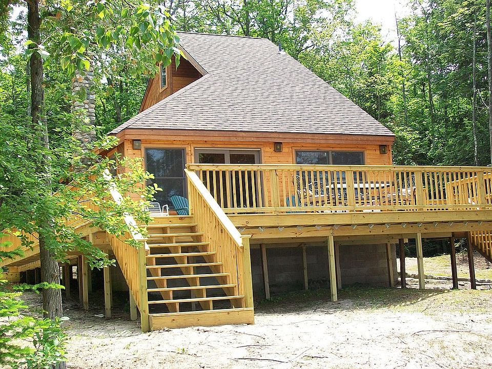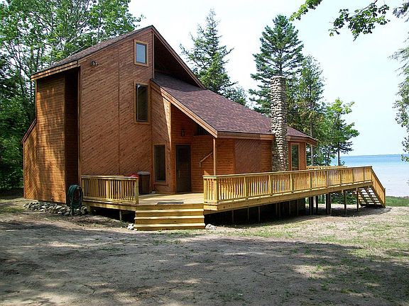 Beautiful 2-bedroom, 2-bathroom home on Parcel 4 of Bonners Landing with 200 feet of nice beach frontage and 13.22 acres of land behind. A year-round lakefront home that could be used as a retirement home but done with good quality wood paneling inside and outside for a wonderful north woods cabin effect. Has a detached garage behind the house. This two-story plus third floor “eagle’s nest” loft home has decks on two sides, a sitting deck out in front of the treeline and an open kitchen-dining room-living room area on the lakeside with a lot of glass and sliding doors to the deck. A master bedroom with en-suite bathroom and a guest bath are on the inland side of the first floor. Upstairs there is a lofted sitting-reading-TV room and a second bedroom. The blue letters on the sign on Bonner’s Landing Road for the driveway to this house simply says “Heaven.” The home was totally remodeled in 2020 and 2021, with all new electrical, new plumbing, all new waterproof and scratch proof “wood” plank vinyl flooring, brand new kitchen and appliances, en-suite master bath addition featuring dual sinks, bidet toilet and a huge dual head shower, and brand new guest bath. In 2011, new windows were put in, new decks were put on, and the view was reopened.