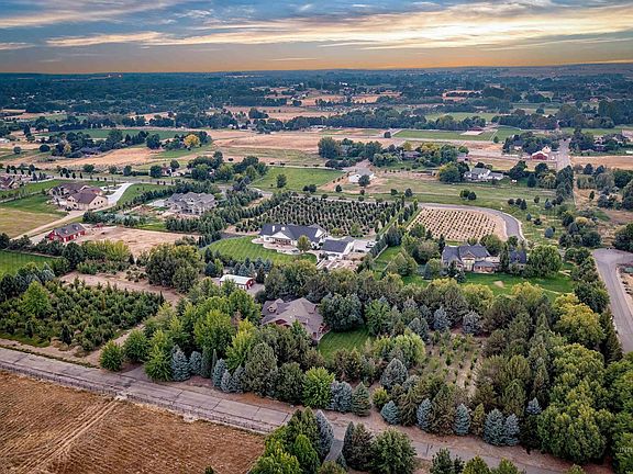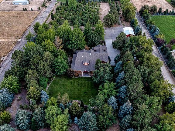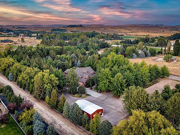 Remarkable private estate nestled in the heart of Eagle on a pristine 5.5 acre lot! Beautiful tree lined driveway greets guests to this nearly 4000sf home. Breathtaking grounds that include multiple waterfalls, wrap around covered patio, hundreds of mature trees w/ truffle farm on auto Capital View irrigation. Fully insulated 42x23 shop leaves endless possibilities! Home is highlighted by 19' soaring ceilings, natural hardwood floors, multiple fireplaces & an abundance of natural light. Flexible floor plan- 5 spacious bedrooms, full primary + additional Jr suite, main level office, bonus room & multiple living spaces for entertaining. Gourmet kitchen boasts granite counters, Wolf range, double oven, breakfast bar, ample counter space + pantry. Master suite features coffered ceilings w/ crown molding, direct patio access, dual vanity, tiled shower, soaker tub and walk-in closet. Oversized 3 car garage and plenty of space to park your toys. Home conveniently has natural gas, water rights, well and no HOA dues!
