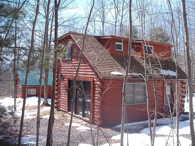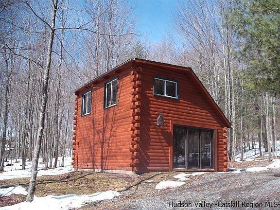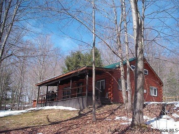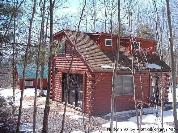 Pure Catskills at its best with a lovely and well maintained log home and a super guest house with plenty of room for friends & family all in the Heart of The Catskills. Main house consists of two sweet bedrooms, loft area, country kitchen and a full bathroom with window. Great wood burning fireplace will be the place to pull up your chairs as the fire roars and all are toasty & warm. Metal roof on main house is only about two years old, 200 amp service, wood floors and lots of country charm. Take in the mountain views from the porch as you relax and listen to the quiet, stroll down to the pond with its clear spring fed water, Rainbow Trout and perfect setting. Guest house has two stories, nice bathroom, plenty of natural light and room for easy accommodations. Many Christmas trees are on the property, stone walls, mature trees, trails, shed and the cutest spring house as part of the setting. Property consists of three deeded parcels, good road frontage and two access points.