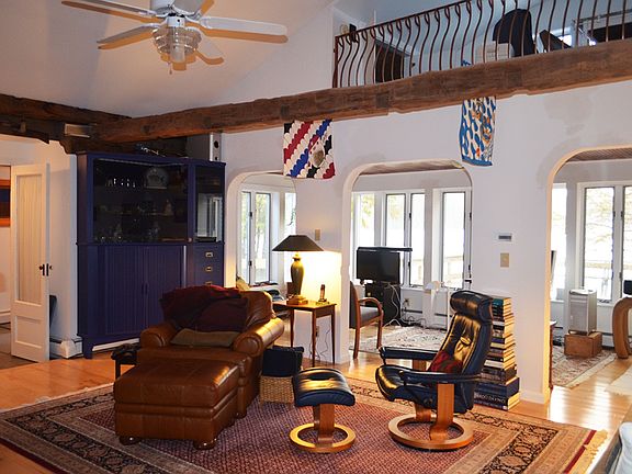 This modern 6-bedroom, 3.5 bath lakefront home offering some ±4,000 square feet of year-round living space sits on ±0.94 acres with ±150 feet of private direct lake frontage on Arnold Lake. The first floor entails a tiled foyer with half-bath, private master suite with large living room, built-in cabinetry, propane fireplace, lakefront screened porch, en suite master bedroom with walk-in closet; dining room, spacious cathedral ceilinged living room with fireplace, gourmet kitchen with Sub-Zero and Thermador appliances, large pantry, mud room, three bedrooms, and full bath with laundry. The upstairs features a private en suite master bedroom, dressing room, abundant closets, exercise room, private deck; spare bedroom/nursery, and office/library. Wonderful attention to details, hardware, fixtures, abundant natural light, and ever-present lake views throughout. Multi-level decks and sunrooms overlook the lakefront with lawn and swimming/boat dock. Central air conditioning, and propane generator. 3 car garage, with storage, studio/loft above, boat garage, and plenty of parking. This lovely home is perfect for relaxed waterfront living and experiencing the best of every season. Being sold to settle an estate.