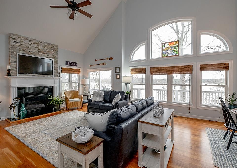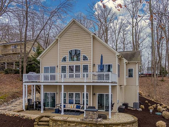 Awe-inspiring view!! Newly renovated mostly FURNISHED home nestled among old-growth hardwoods, slightly elevated above the pristine waters of Lake Gaston makes for a breathtaking setting! New-6,000 boat lift-Paint-hardwood floors- tile in lower level-custom stone at fireplace & more! The spacious open great room w/ hardwood flooring & wall of windows takes advantage of the amazing natural beauty of this lot. The kitchen has pantry, granite countertops & new backsplash. The loft, overlooking the great room, could be used for an office, game rm, or an additional sleeping area, as this home has a 4 bedroom septic system. The inviting rec room & beautiful paver patio on the lower level w/ new firepit is perfect for entertaining. LOW MAINTENANCE -concrete drive- landscaping-walkway to boathouse w/upper sundeck all composite decking&attractive vinyl railings. Gated community conven. to I-85!
