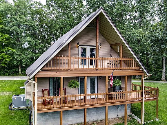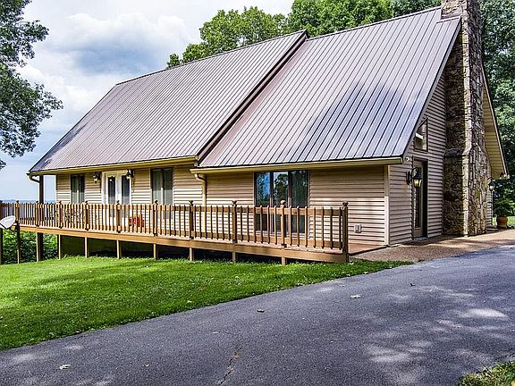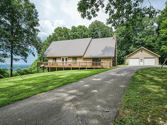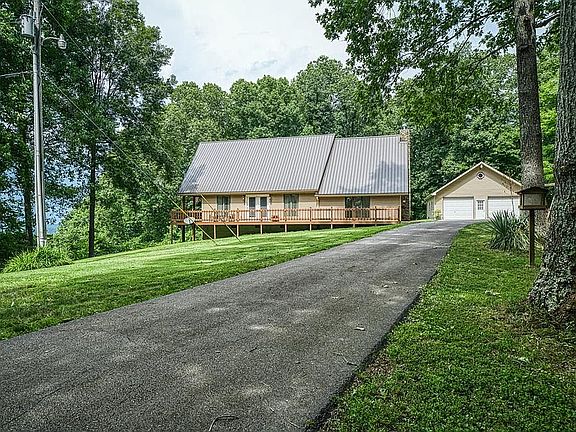 Wow wow wow you'll say when you see the view from the deck at this Dale Hollow Lake home. The setting is picture perfect - 5 private wooded acres with the home precisely placed at the top of the knoll to get the maximum enjoyment of the view of the Cumberland River Valley and the distant mountains and just minutes to several marinas. The home exterior is low maintenance vinyl siding and new metal roof 2019. Detached 2 car garage is handy for storing boats, lake toys etc (wood stove too). Interior features hardwood floors, granite countertops, 2 gas log fireplaces (one in the great room, other in the den). The main floor is open concept kitchen dining and den, Master bedroom/bath suite, a second full bath for guests and extra large great room. Upper features 2 bedrooms (1 with balcony view) and a 3rd full bathroom. Systems are all electric and efficient. HVAC 2020, hot water heater 2019, new tile shower, gas wall heater for auxiliary heat. Bonus storage rm. above garage.