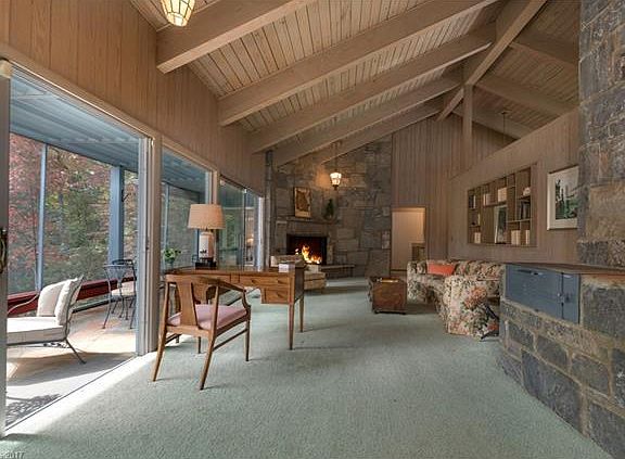 This special 2BR/3BA mid-century stone & wood home is a real treasure. It has a an open/airy feel with it's high wood beamed ceilings, soaring stone fireplace and unusual floor plan yet at the same time is cozy, comfortable and private. You will step back in time but you will also feel the very contemporary/timeless aura and quality. The screened porch and stone terraces allow for outside access from almost every room. There is an additional garage and a charming 1BR/1BA guest house.