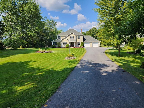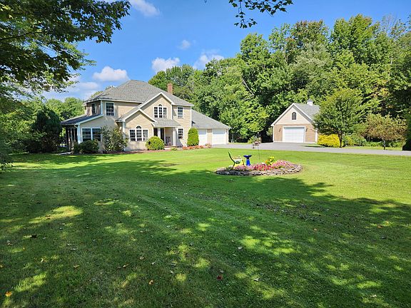 Beautiful 3BR/2.5BA colonial situated on 8.21 acres! The property is tastefully landscaped with flowering perennials, bushes, rock walls, and mature shade trees. Enjoy the outdoors sitting poolside with friends & family, or on the back porch/patio with a book and your morning beverage or counting stars and eating s'mores around the fire pit. The front entrance welcomes you into the home where the main floor features a spacious eat-in kitchen with tile floors, SS appliances and Corian counters, a formal dining room, living room, half bath w/ laundry and a bright and cozy 4-season sunporch. The Master Suite w/ large walk-in closet and full bath is located on the second floor along with 2 additional bedrooms and private office/reading nook. The 14x28 in-ground pool is a bonus addition to this property. Fenced in and private, it's a nice place to relax and enjoy a warm summer day! The 2 garages offers storage for 3+ vehicles and/or lawn equipment, recreational toys and other large items. Don't miss out! Come visit your new forever home today!
