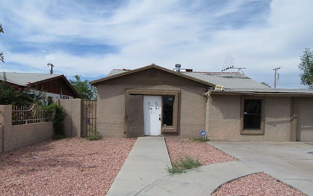 Two bedroom, 1 bath brick home with 2-car tandem garage on large lot in Saguaro Tract Subdivision in South Phoenix just north of Freeway. Block w/wrought iron fenced front yard plus additional slab parking in front yard. Great room, dining room w/laminate wood floors open to kitchen. Bonus room in back. Large block-fenced back yard w/RV Gate in rear for alley access. Garage also opens to back yard w/paved drive to alley gate. Built-in BBQ. Great potential!! Waiting for your special touches. No HOA. Property sold AS-IS. Buyer to verify all measurements, facts, figures, everything material to Buyer including Schools. Equal Housing Opportunity