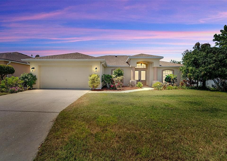 Beautiful 3 BR 2 Bath open floor plan with split bedroom. Master bedroom has Garden tub + shower, and 5' x 9' walk in closet. Corian counter tops in kitchen including 7' Bar. Recessed lighting in kitchen. 12' x 13' Formal dining room, high ceiling in living area, 11' x 13' bonus room, and 5' x 7' inside laundry room. French doors leading to 12' x 17' Enclosed lanai at rear overlooking wooded area for privacy. BRAND NEW ROOF in March 2024