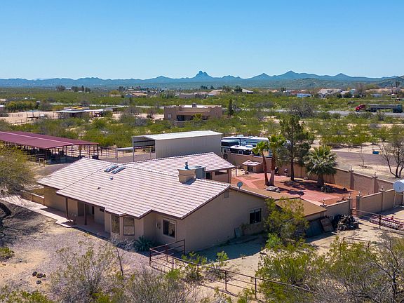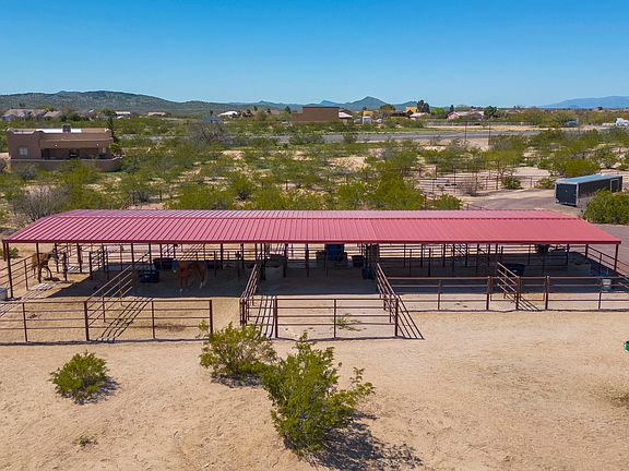 A TEAM ROPER'S DREAM at Nine Iron Ranch!! 220' x 120' arena which includes all the components needed to practice team roping. Seller will credit the buyers $25,000 for home remodel!!! This over 4 acre property provides 10 covered pens, 8 turnouts, a generous mare motel, and a round pen. Ride out your gate and up the nearby wash all the way to Congress. The home's well laid out floor plan includes 4 bedrooms, 3 baths, a family room with views and a fireplace, a formal dining room, an attached 2-car garage and much more. From the front porch, look over the arena and take in the big mountain views. Property also includes a private well, RV hook up, and a large RV garage/equipment shed. It is fully fenced and gated for privacy.