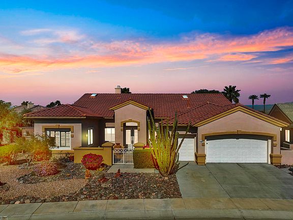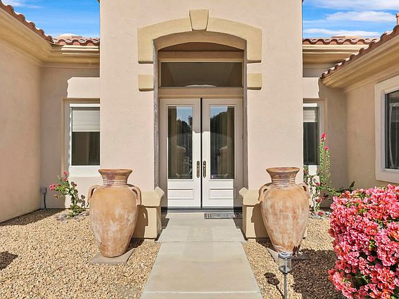 Rarely available, this stunning Tuscany plan residence within the confines of Sun City Palm Desert welcomes you with a spacious open floor plan and striking architectural details. This 4-bedroom, 4.5-bathroom estate home spans 3412 square feet of gracious desert living, on a beautifully landscaped low maintenance 12,400 square-foot lot with a large very private rear yard. A separate detached Casita completes the perfect desert retreat.Upon entry, you're greeted by soaring 12-foot ceilings that accentuate the living and dining areas, flowing into the great room, perfect for entertaining guests. The gourmet kitchen, featuring custom cabinetry and a large granite countertop for cocktails or informal dining. The main house boasts three ensuite bedrooms, each offering luxurious amenities, large baths and ample closet space. The master bedroom, accessed through double French doors, features a fireplace and built-in cabinetry in the enormous walk-in closet, while the second bedroom suite opens to the backyard and spool. The third ensuite bedroom can double as an office, complete with a split air conditioning system. The detached Casita offers a spacious living area and a full bathroom. The pebble tech spool with decorative tiles and spillway water feature, providing the ultimate oasis for relaxation and rejuvenation.The expansive patio has a built-in gas BBQ, while the majestic, tiled fountain with lights sets a tranquil ambiance.