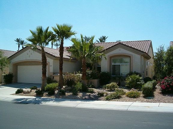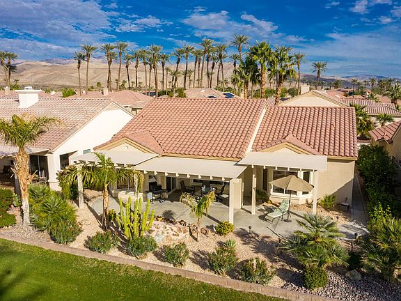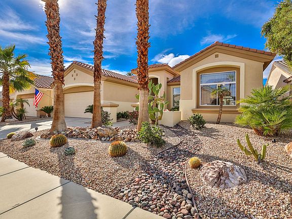 This fabulous Tangier floorplan has 2 bedrooms separated for maximum privacy and a den with French doors that can be used as a guest bedroom. The views are fabulous across the fairway and out to the mountains. The kitchen has been upgraded with new gorgeous quartz countertops and stainless appliances. The floors have beautiful 16-inch tile and carpet. The master bedroom has a bay window with a view of the golf course and mountains. The master bath has a dual vanity, a walk-in custom closet, and a walk-in shower with rain glass. The guest bedroom is extended with a French door out to the courtyard and is adjacent to the 2nd bathroom. As you enter, you notice the amazing view of the 7th tee on the San Gorgonio Golf Course. The patio has an Alumawood cover, extended patio, a soothing waterfall fountain, and distant views of the golfers on the tee box. There are Meyer lemon and orange trees among the easy to maintain desert landscaping. The home was recently painted in soft desert hues and there is a walkway all the way around. The laundry has a newer washer and dryer, included, storage cabinets, and a convenient sink. The 2 car 4' extended and fully insulated garage has a golf cart nook, storage cabinets, central vac system. This home is available turnkey furnished outside of escrow.