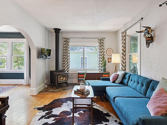 features natural sunlight and wood burning stove. The hardwood floors add a touch of style and elegance.