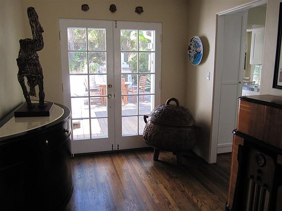 Private hillside lot but home sits on large flat area with lovely large backyard deck and fireplace for entertaining. Original home built in 1941 but remodeled later and recently has updated stainless appliances . 2 bedrooms and bath are downstairs (entry level);Master with french doors to a balcony and library are upstairs with 2nd bath. Living room is bright with several windows and hardwood floor; dining room has french doors leading to the back deck and lg. yard. Inside laundry.