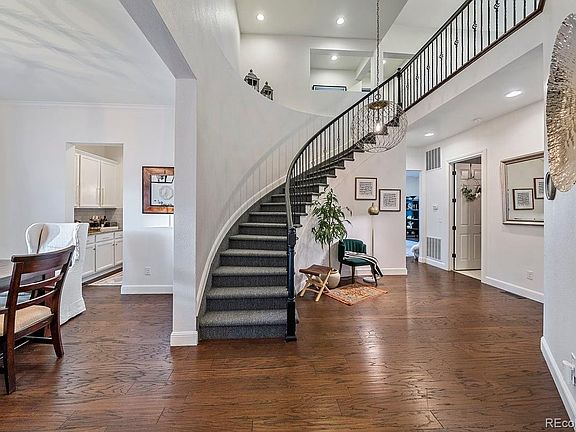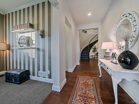 Welcome to the hidden gem of Terrain in Castle Rock.30 min from Denver this sanctuary is known for its small town feel and tranquility.Terrain is a master community with two parks, two pools, an established local school and SPACE.This home sits on the largest lot in the whole sub-division and has been updated and upgraded throughout.This sought after half acre has been professionally landscaped with french drains, over 20 trees, 60 scrubs, a fabulous water-fall, expansive trex deck, stamped paths, and a slab for the Bullfrog Jacuzzi.Inside this semi-custom Taylor Morrison home you will find enormous natural light, hardwood floors and fabulous custom finishes.A new concrete patio was just poured in the front and an extension to the drive-way added.The formal living room with custom shelves, paint and crown molding leads you into a large foyer with 25 ft vaulted ceilings.The formal dining room can fit any size table and leads into the butlers pantry.The best room in the house is the great room and has unbelievable natural light, a floor to ceiling stone fire-place and is a fabulous entertaining space.The gourmet kitchen features stainless steel appliances, a new refrigerator, a very large granite eat-in island, a breakfast nook, a built-in desk, and lots of cabinet and counter-top space.The mud room is a favourite as it is larger than you would think and features built in lockers, cabinets and a built-in dog crate.The garage was recently finished with drywall, paint and a polyuria coated floor. Up the spiral staircase is a cozy loft, four bedrooms, a laundry room and three full bathrooms.The Primary bedroom has clear crisp views has been extended as an upgrade.Through the 5 piece bath is your oversized walk-in closet.The second bedroom is en-suite with a walk-in closet and the 3rd and 4th spacious bedrooms share a full bath.Escape to the basement which was recently finished and has a stone wall feature that encloses the media room and a huge white quartz wet bar.