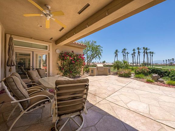Sun City Palm Desert - Monterey. This popular greatroom home provides some on of the most spectacular views in Sun City... looking south down the 7th fairway and over 100 palm trees and the Santa Rosa Mountains. The spacious rear yard features a decorative concrete patio with multiple sitting areas, a BBQ island and desert landscaping. A gated from courtyard and decorative concrete hardscape provides curb appeal. All windows have been replaced. Inside, 10ft ceilings and transom windows providing abundant natural light. 18in tile is in all but the bedrooms. The greatroom has a custom built-in media center. The kitchen has slab granite counters, raised panel maple cabinetry with antiqued affect and pull-out shelves, under cabinet lighting and a breakfast bar with pendant lighting. The den/office has a custom built-in desk and cabinetry. The primary suite has French doors to the rear patio, plantation shutters and a huge walk-in closet with custom built-in storage. A pocket door opens to the primary suite bathroom which has dual sinks, a stall shower with glass enclosure and an oversized tub. The spacious guest suite has shutters and in its ensuite bathroom there is a stall shower with textured glass doors. A pedestal sink in the powder room. Extensive cabinetry and a utility sink are in the laundry room. The 2+ golf cart golf cart garage has an epoxy floor. Dual AC new in 2014.