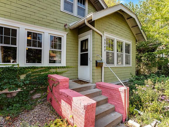 Classic Powderhorn Park home with cute curb appeal! Darling green home w/ red steps welcomes you inside to cozy + well maintained enclosed front porch. Gorgeous dark wood trim + hardwood floors throughout living/dining rooms, w/ piano windows. Windowpane door from porch into living room ties spaces perfectly together. Stunning built-in buffet in dining room. Kitchen continues the hardwoods, w/ tile backsplash. Brand new stainless steel appliances just last month! 2 bedrooms + full bath on main level. Sun room out back is an ideal retreat at the end of the day, complete with bench swing + light walls to soak up every last ray. Lower level w/ ultra cozy family room + play area. 3rd bedroom w/ egress window is non-confirming due to ceiling finish. 3/4 bath, laundry room, + storage/bonus space. Grill out or chill out on back deck or patio. 2 car garage, and close to local eats, treats, and recreation. Are you the next owner?!
